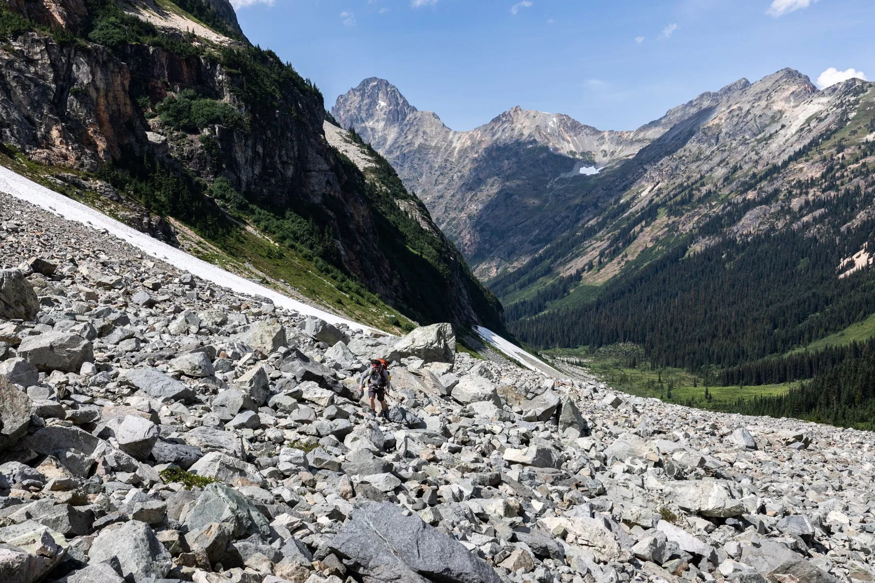 While traversing the boulders, we ran into another couple who were also attempting to make it to Silent Lakes, with the additional goal of scrambling up Fisher Peak the following morning. We took a few breaks and chatted together as we collectively headed up the valley.