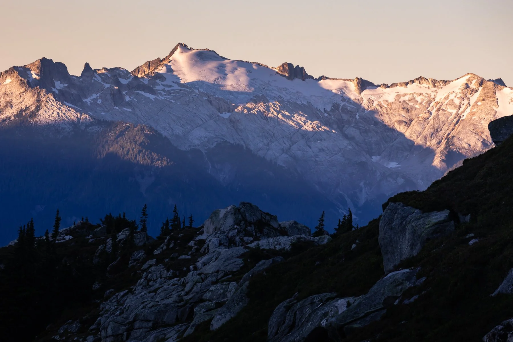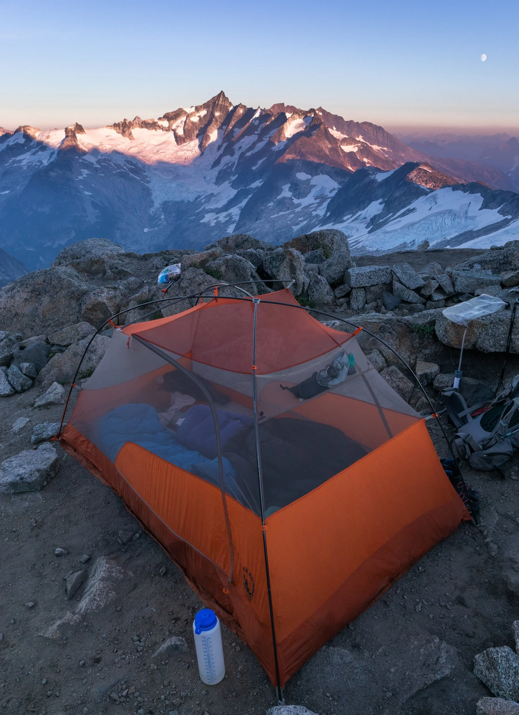 We made it to camp at the upper basin near Eldorado Creek by mid-afternoon. There was a part of me that wanted to continue on to the Eldorado High Camp—it would have been another couple miles and 1,500’—but the day had already felt so long. So instead we set up camp, napped, and waited for sunset, which turned out to be a stunning welcome to the high alpine.