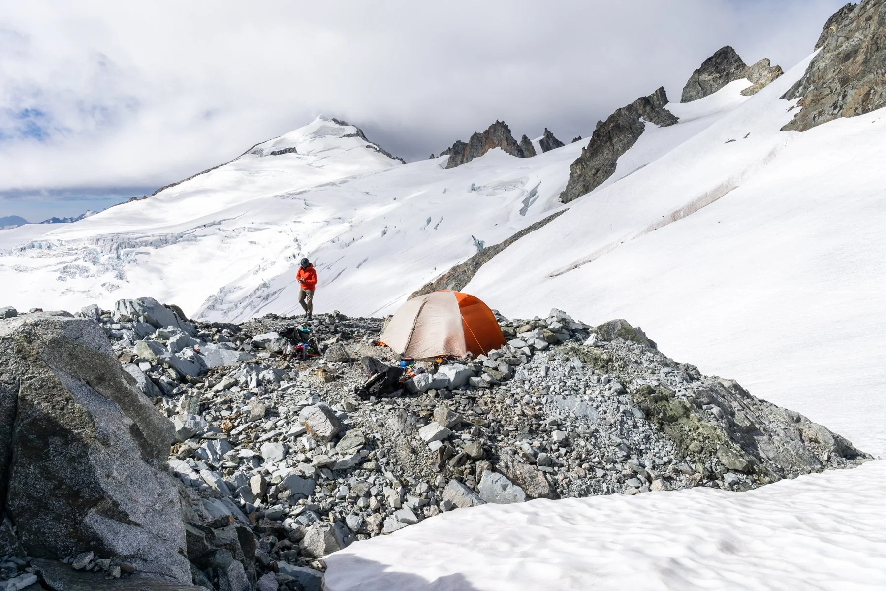 It didn’t take long for us to get to the col and we were happy to find that the snow had melted out enough that it revealed rocky platforms created by previous climbers. Alex and I chose a sheltered little spot and got to work setting up the tent.