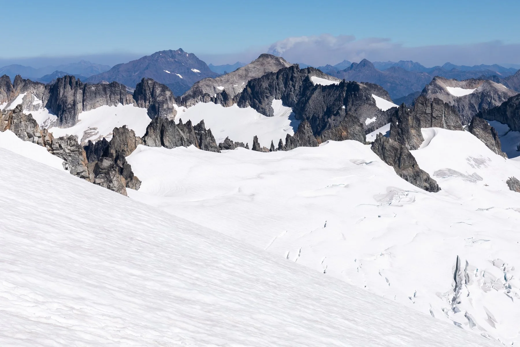 Unfortunately, the arrival of the smoke coincided with our planned biggest day. We planned to leave our camp at Klawatti Col, travel over the Klawatti Glacier, climb Austera Peak, navigate our way to the North Klawatti Glacier, climb Primus Peak, pick our way down the Borealis Glacier, and finally end the day at Borealis Lake for camp—a route we expected to take six to eight hours and plenty of route-finding.