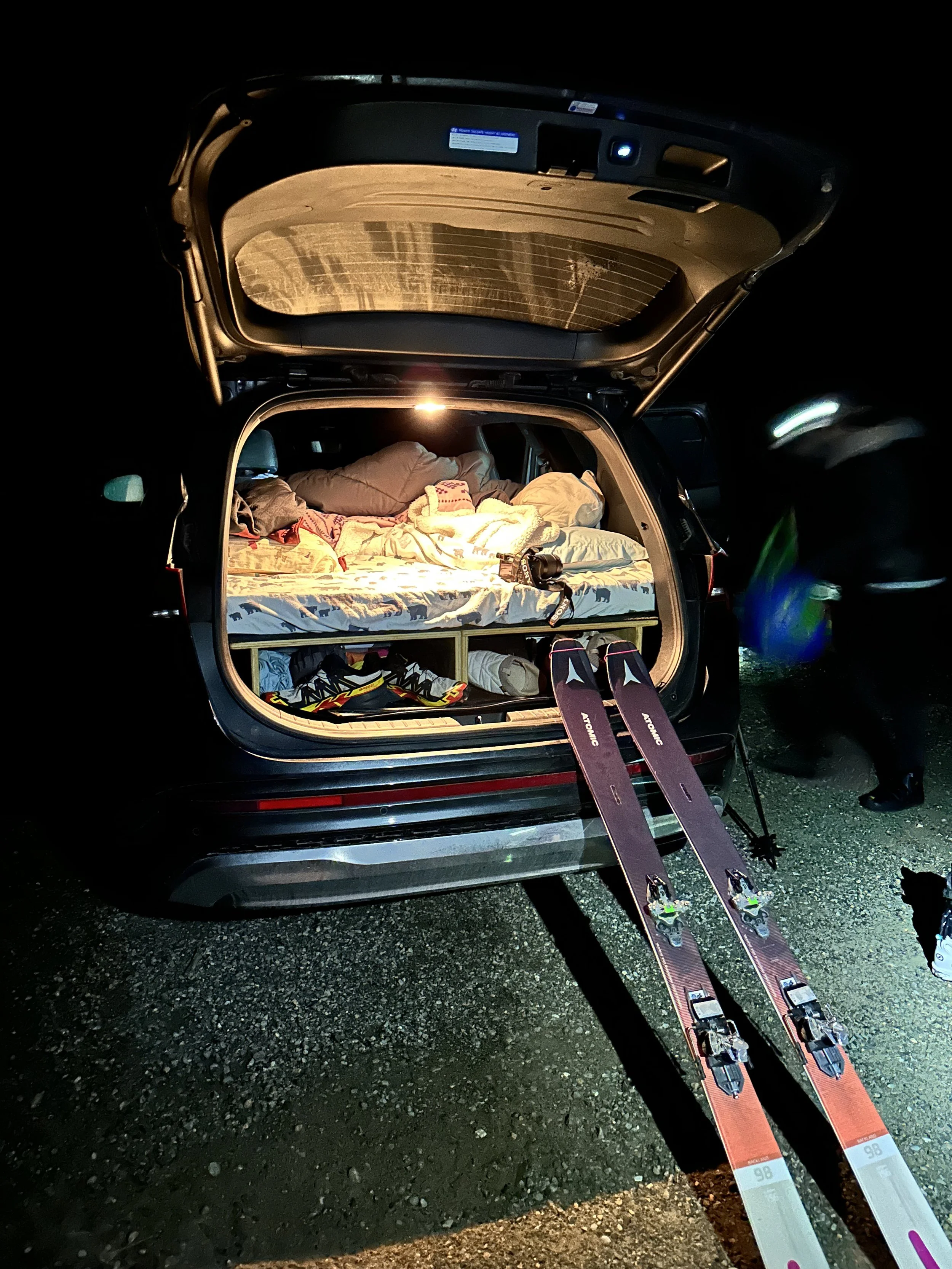 We arrived to the trailhead lot in the dark at 8:45pm and found two other vehicles already parked. Sander got to work setting up his tent near our car and we assembled our sleeping platform. We set our alarms for 3:45am and headed to bed to try to eke out as much sleep as we could before our 3:45am wakeup call.